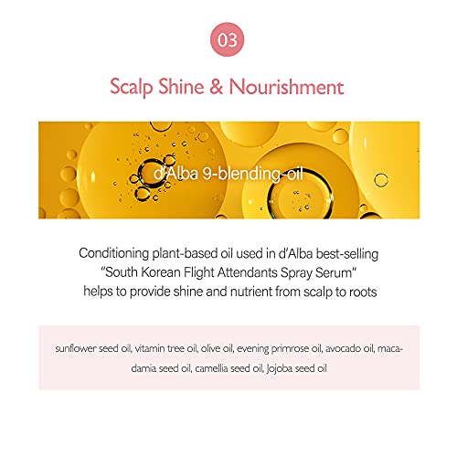 - The mixture of silk extract, hydrolyzed keratin, d’Alba-9 blending oil, tocopherol, and patented amino acid complex etc. provides deep nourishment and protection to the scalp and hair.