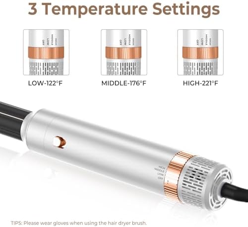 - [SAFETY FIRST] - We prioritize safety with an NTC feedback system, a bi-metal thermal switch, and an irreversible fuse. The hot air brush offers a quick cooling function by double-clicking the temperature button. Comes with heat-insulating gloves in case of burns. The air styler for hair curling with an Ergonomic button design, concentrated on the upper part of the body, prevents accidental clicks, also we added an ALCI plug to this hair-drying brush.