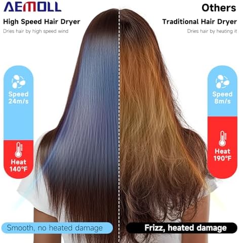 - 【Super Fast Drying】--- AEMOLL hair dryer is equipped with a 150,000 RPM high-speed brushless motor, wind speed reaches 24 m/s (79 ft/s ). Which can quickly dry your hair in 2-5 minutes.Powerful airflow dries up to 3x faster than traditional hair dryers.