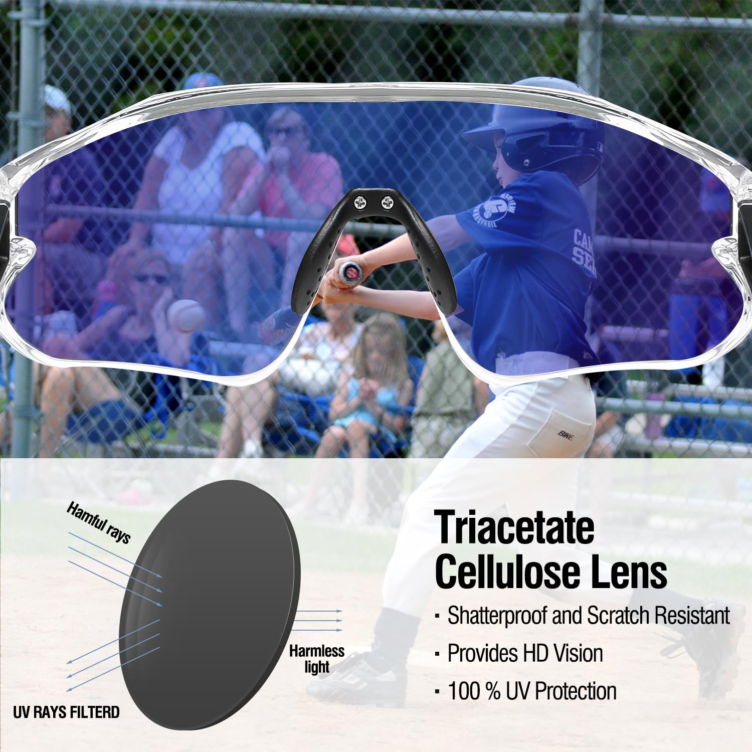 - 【DESIGNED FOR SPORTS】 -- These youth sports sunglasses offer 100% UV protection and clear vision,making them ideal for outdoor sports,such as baseball,softball,climbing,driving,fishing,golf,hiking,running skiing,cycling and so on.