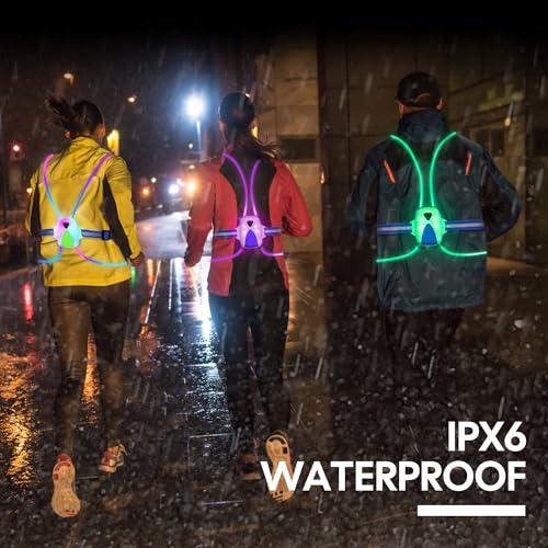 - 【6 Multiple Colors & 3 Modes】The running light vest includes 6 colored modes with 3 customized modes. Reflective running gear can choose between 6 Led RGB colors - Green, Red, Blue, Yellow, Pink, White and 3 RGB flashing light modes. With a simple click, you can change the colors and patterns to match your running style and make your runs truly personalized. High visibility and multiple colors can be used as a safety warning light so that oncoming pedestrians and drivers can easily spot you.