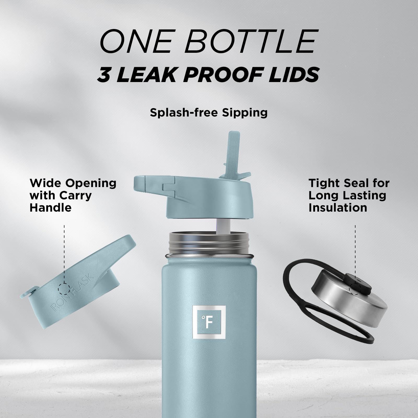 - 3 LIDS: YES, Iron Flask comes with THREE different leakproof lids. Carabiner Straw Lid with 2 Straws, Flip Lid, and a Stainless Steel Lid! *NOTE: The stainless steel lid is plastic from inside and stainless steel from outside*