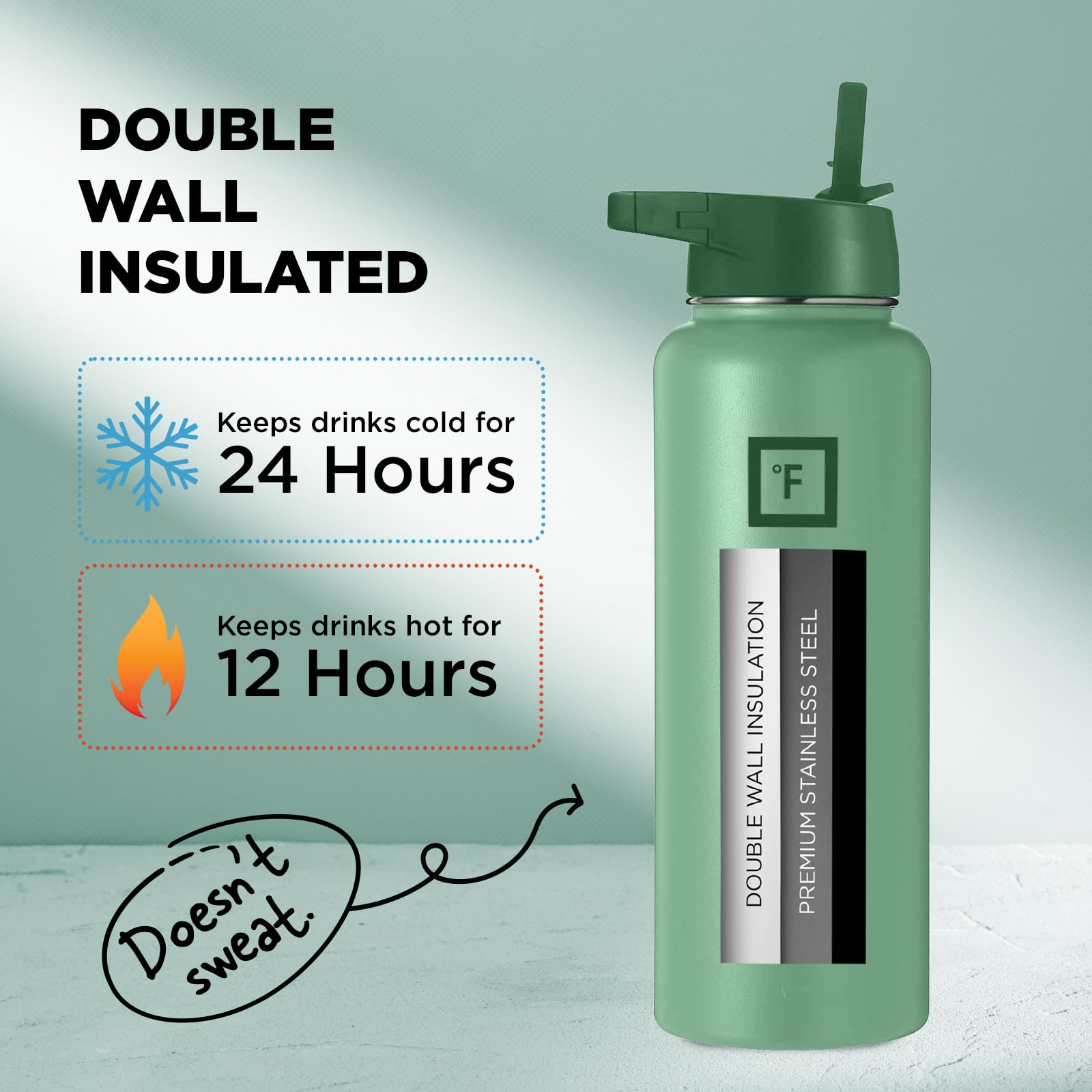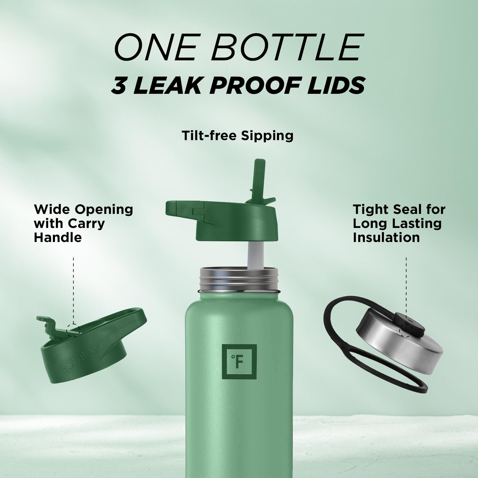 IRON °FLASK Camping & Hiking Hydration Flask, Wide Mouth, 3 Straw Lids, Stainless Steel Outdoor Water Bottle, Double Walled, Insulated Thermos, Metal Canteen - Sage Grove, 40 Oz